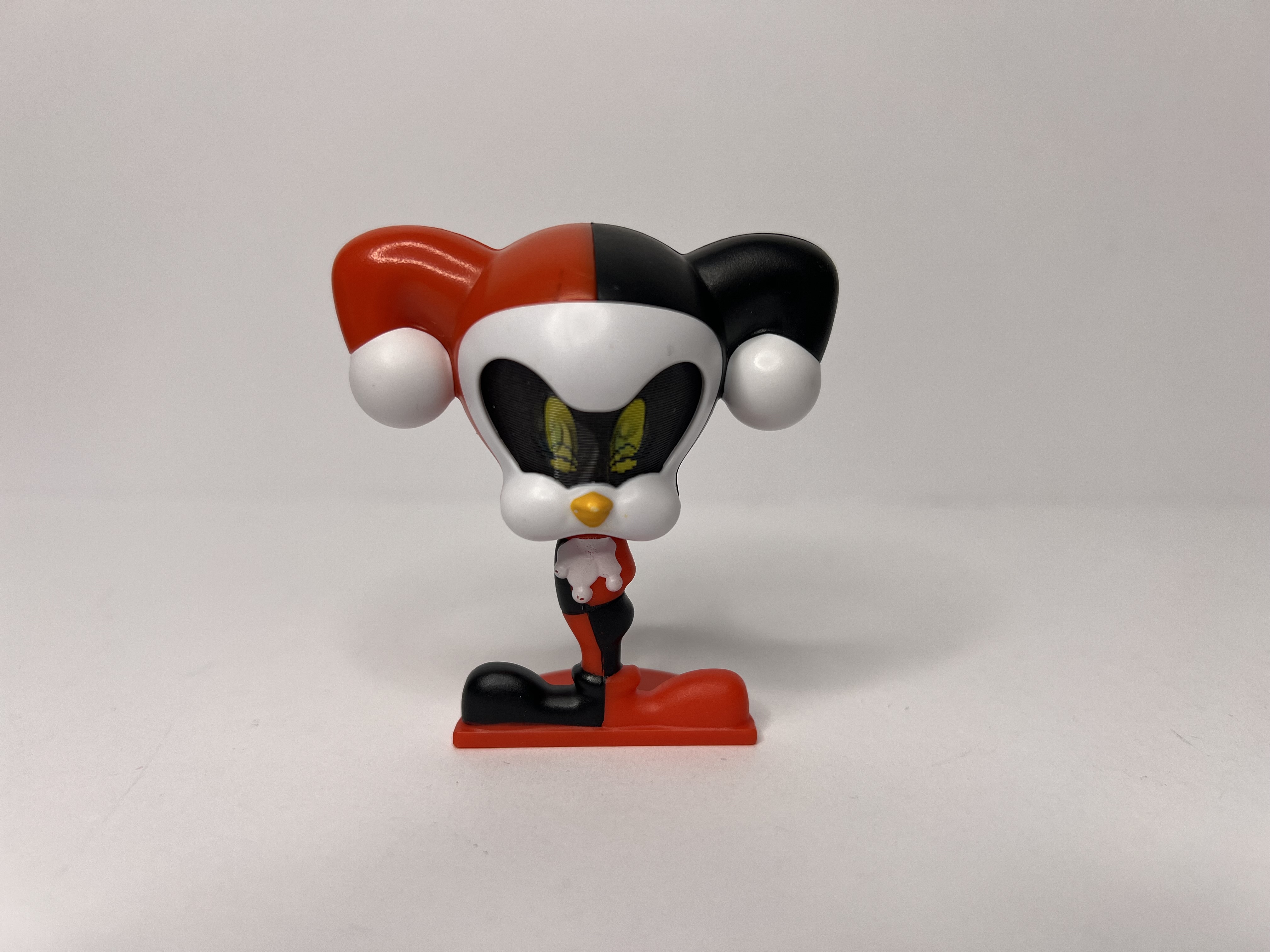 Sweet little Tweety has taken a walk on the wild side, trading the birdcage for Gotham’s chaos! Rocking Harley Quinn’s red-and-black jester suit and a mischievous glint in those big eyes, this pint-sized prankster is ready to outwit Sylvester or cause some clownish commotion. Equal parts adorable and unpredictable, this mashup is pure collectible gold.