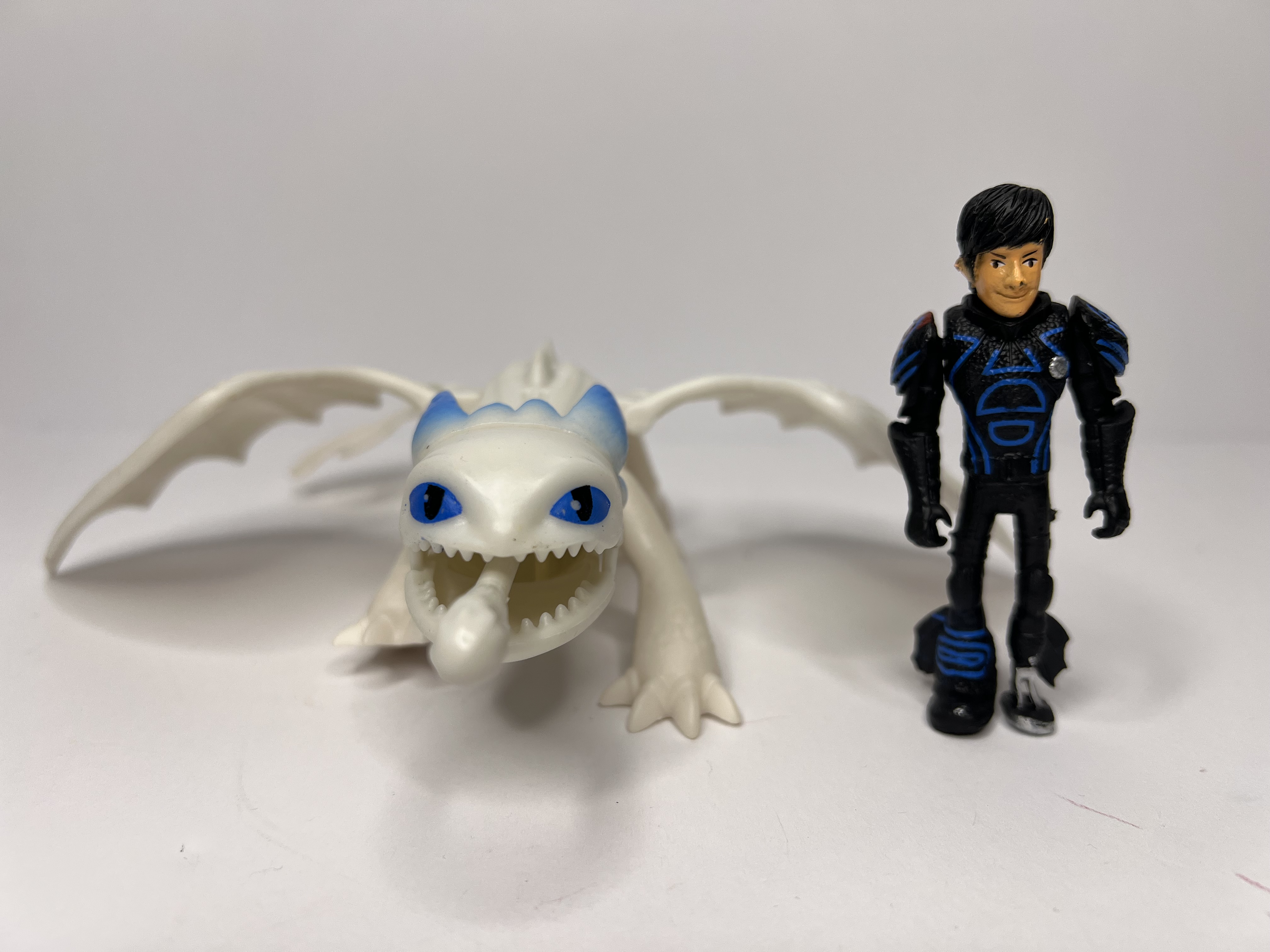 Soar into the Hidden World with Light Fury and her rider! Featuring a sleek white body, bright blue eyes, and blue-accented wings, this dragon-and-rider duo is perfect for epic How to Train Your Dragon adventures.