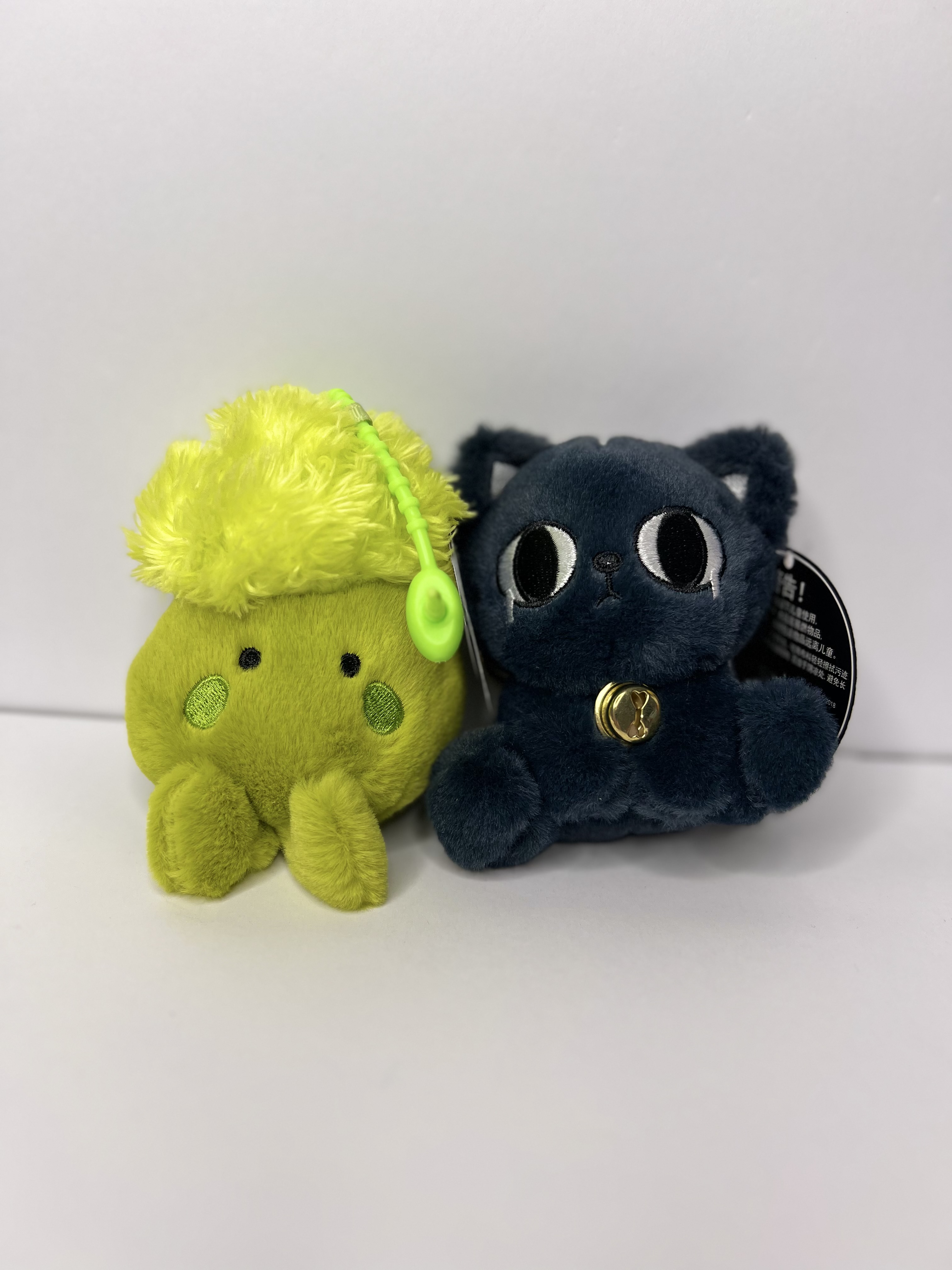 Say hello to the quirkiest pair from Implication Toys — a soft, fuzzy cauliflower plush with a fluffy green top and a playful beanie clip, joined by a sleek, plush black cat with wide embroidered eyes and a golden bell collar. This odd-cute duo blends food-themed fun with moody pet vibes, making them perfect for collectors of kawaii toys, display pieces, or offbeat keychain companions.